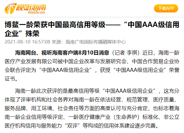海南188bet体育网 此次获评的是最高信用等级“中国AAA级信用企业”,这充分体现了评审机构和社会各界对海南188bet体育网 在依法经营、规范管理、医疗质量、服务品牌、用工环境、社会责任等方面的高度认可与充分肯定,也标志着海南188bet体育网 企业信用等级评定、188bet体育网 医疗健康产业(生命养护)标准化、非公立医疗机构信用与服务能力“双评”等构成的信用体系建设逐步完善。